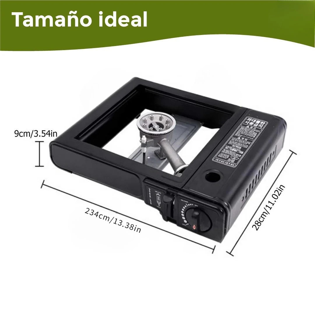 Mide aproximadamente 30 cm x 30 cm x 15 cm, pesa alrededor de 1,74 kg. Ideal para llevar en mochilas de camping o maletines.